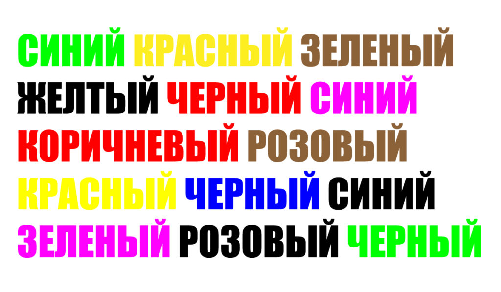 Необходимо быстро назвать цвет слов. Это упражнение помогает синхронизировать работу обоих полушарий.