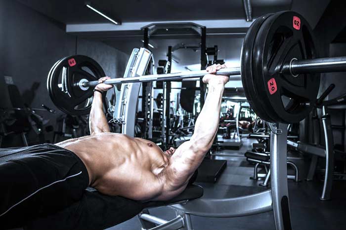 Если твоя грудная клетка находится в последней стадии рахита, то лучшее лекарство — жим лёжа. Ляг на горизонтальную скамью, возьмись за гриф хватом чуть шире плеч. Опуская штангу, делай вдох, при подъёме — выдох. Локти держи поближе к туловищу. Всего сделай три сета по 8-10 повторений.
