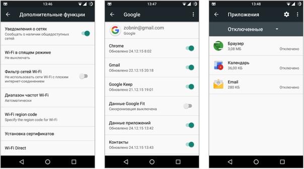 Меню расширенных настроек WIFI, Отключение синхронизации и список отключенных приложений.