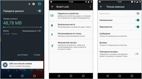 Контроль трафика приложений, окно настроек Smart Lock и настройка режима “не беспокоить”