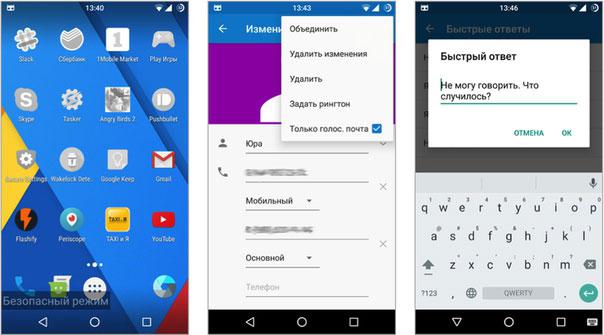 Отключение сторонних приложений в безопасном режиме, отправка контакта в черный список и редактирование быстрых ответов в Андроид.