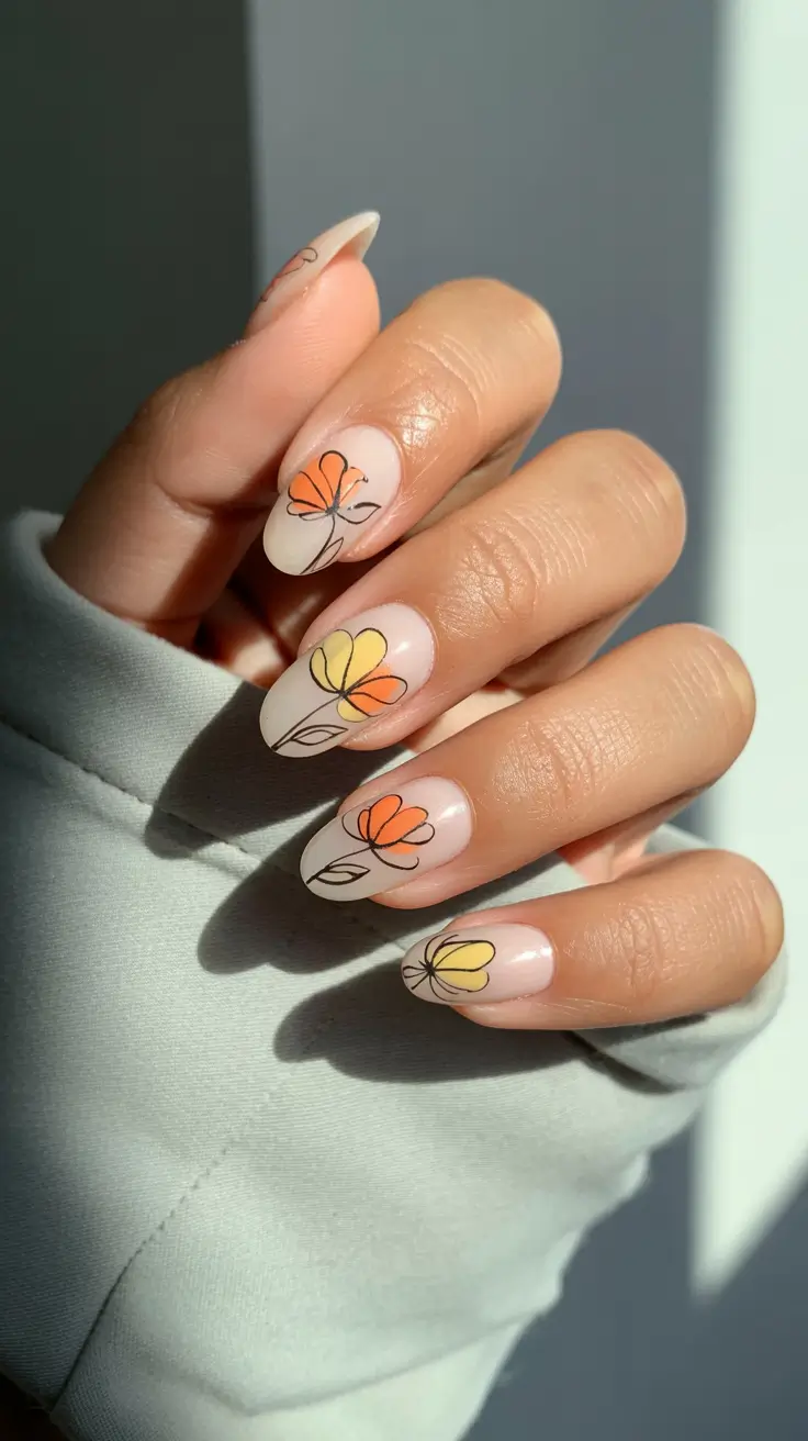 Тонкая чёрная линия с нежными оранжевыми и жёлтыми лепестками и молочно-бежевой нейтральной основой. Кажется, будто цветы втиснуты между страницами дневника — стиль воздушный, но основательный. На светлой коже этот образ выглядит особенно выигрышно, поскольку прозрачная нюдовая основа не перебивает естественный цвет, а тёплые оттенки придают ему сезонный шарм.
