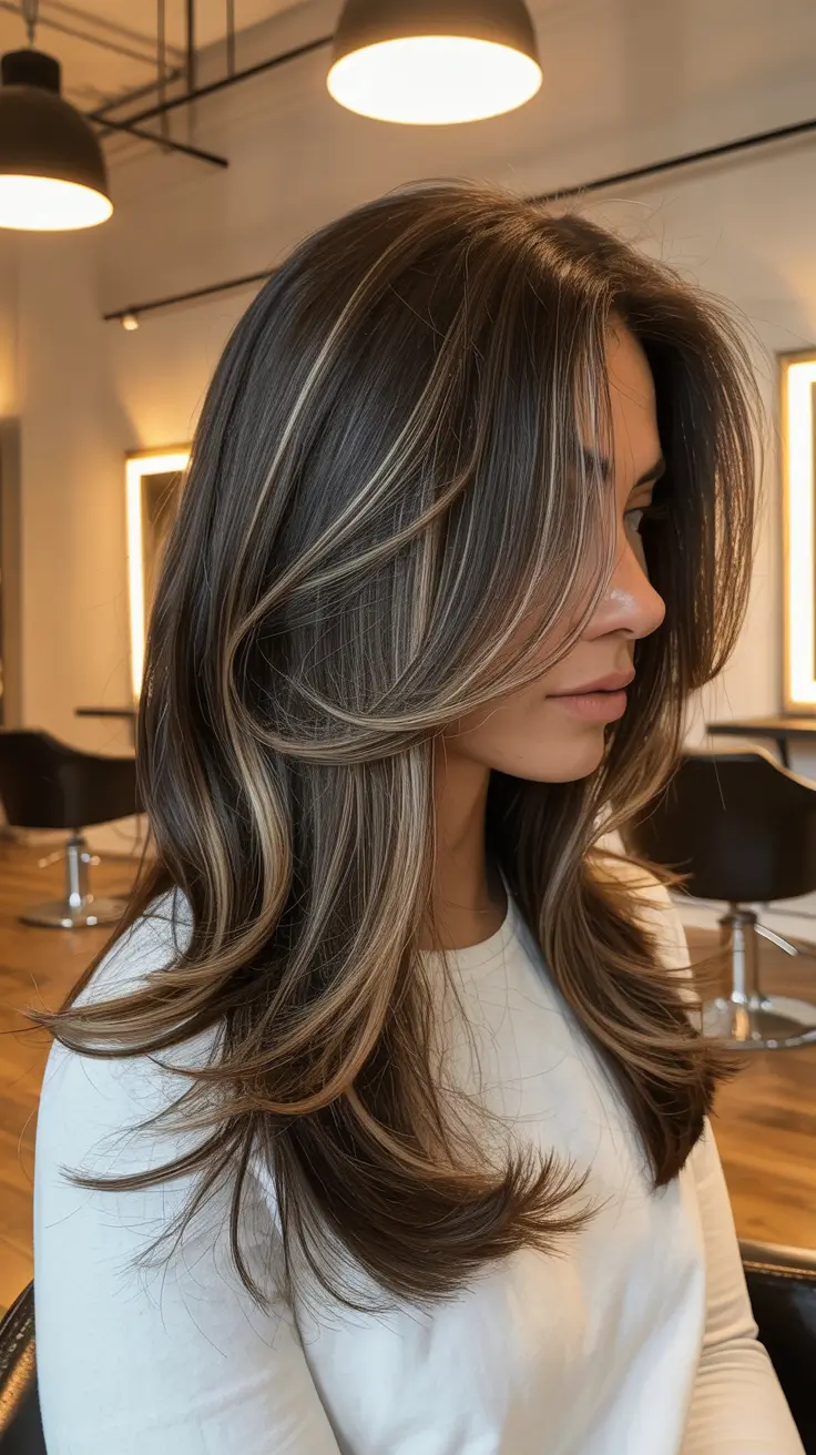 Один из самых ярких трендов осени 2025 — тёмные волосы с серебристыми бликами. Эта тёмная многослойная причёска выглядит потрясающе и объёмно благодаря бликам холодного оттенка, которые красиво обрамляют лицо. Она состоит из так называемых «пушистых» слоёв, которые придают волосам лёгкость и изящество.
