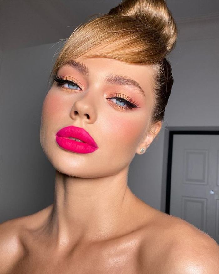 Если вдруг в этот романтичный день вы решили выделиться среди толпы розовыми тенями, то вот вам важный совет: немного смочите водой кисть для теней, чтобы в итоге макияж получился более сочным, а взгляд смелым.
