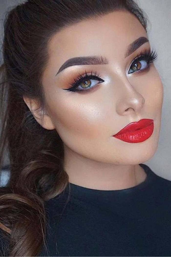 Естественный макияж в этот праздничный день может смотреться немного скучно, но не менее красиво. Если вы приверженец натуральных оттенков – не бойтесь использовать их. Отличным завершающим штрихом такого макияжа будет яркий и страстный контраст на губах.
