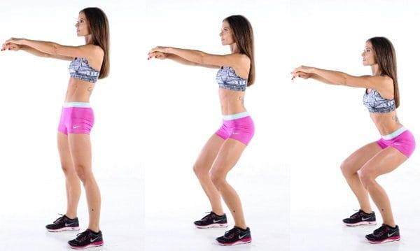 Расставь ноги на ширину плеч и сделай глубокое приседание. Присядь, а затем не вставая полностью, пружинь 5 раз. Это упражнение следует повторить 15 раз в 3 подхода.