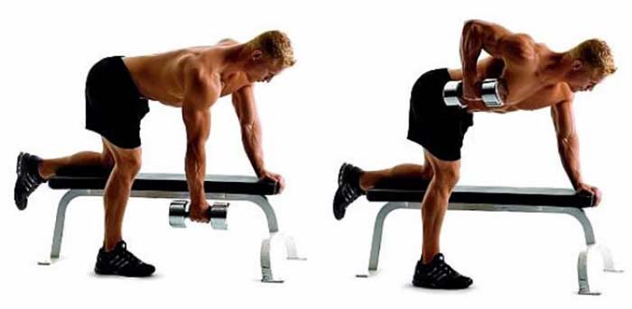 Возьмите гантель в правую руку. Обопритесь коленом левой ноги на скамью. Немного наклонитесь вперед и упритесь левой рукой в край скамьи.