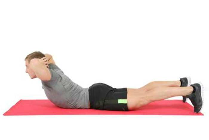 Лежа на животе, сложите пальцы в замок на затылке. На вдохе поднимайте корпус, стремясь тянуться локтями как можно выше. Через 1-2 секунды выдохните и опуститесь обратно.