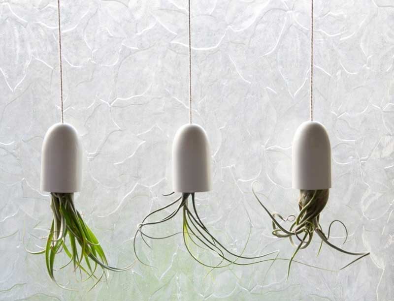 Это, наверное, одно из самых креативных решений. Перевёрнутые кашпо чудесно впишутся в любое помещение. К тому же, так можно высадить практически любое растение – орхидеи, пряные травы, вьюнки и суккуленты. При этом не стоит беспокоится о безопасности такого решения. Растения фиксируются специальным кольцом-замком. Для удержания влаги в кашпо размещается специальная губка.