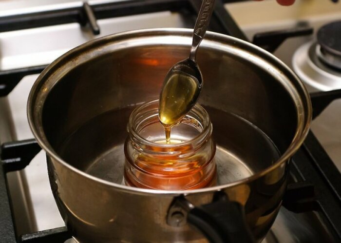Однако густой мед неудобно намазывать на тосты, блины, использовать в процессе приготовления выпечки, поэтому большинство хозяек перед употреблением растапливают его в микроволновой печи, кастрюле или на водяной бане. Так делать нельзя – если мед нагревается до 40 градусов и выше, то начинает терять свои полезные свойства. Поэтому, если вы не хотите получить вместо продукта пчеловодства калорийный сироп, просто держите баночку меда в теплом месте, чтобы он сильно не застывал.