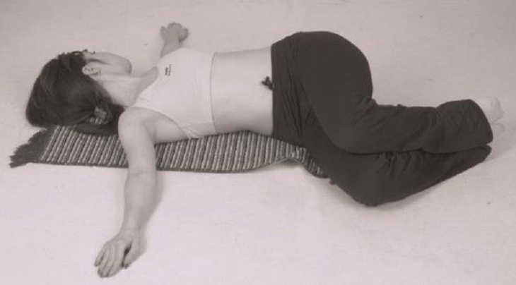 Ляг на спину и постарайся максимально расслабиться. Дыши ровно и глубоко, представь себя в тихом и красивом месте. Раскинь руки в стороны. Соедини ноги вместе и согни в коленях. Колени подтяни к груди. Сделай глубокий вдох и поверни колени вправо, стараясь уложить их на пол. Голову поверни влево и медленно выдыхай.