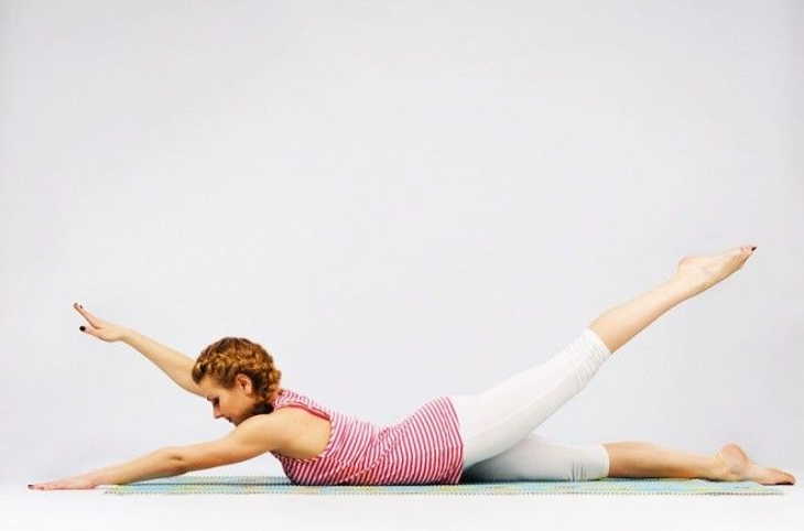 Ляг на живот и одной щекой прижмись к полу. Руки вдоль тела ладонями вниз. Ноги на расстоянии 15 см друг от друга. Теперь напряги мышцы ягодиц, вытяни носки и приподними одну ногу. Другую оставь неподвижной на полу.