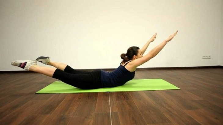 В том же положении согни руки в локтях, голову и плечи приподними. Ладони размести на полу на ширине плеч. Подними обе ноги примерно на 15 см и задержись в таком положении на несколько секунд. Делай махи ногами вниз и вверх, имитируя плаванье. Каждой ногой сделай 25–50 махов.