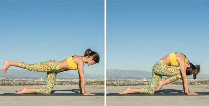 Оставайся в том же положении, голову опусти вниз, а таз подними вверх. Подтяни колено правой ноги так, чтобы коснуться лба. Затем распрями ногу, вытянув ее вверх и вместе с этим подними голову. Повтори упражнение 10 раз с каждой ногой.