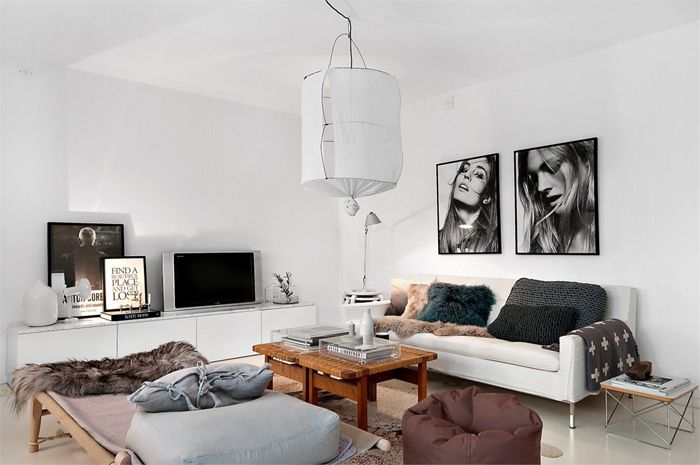 Типичный скандинавский интерьер – это белые стены, простой деревянный пол, большое окно, через которое льется много света, низкий уютный диван, подушки, журналы, теплый плед и черно-белые постеры на стенах. Хочется надеть шерстяные носки, сделать себе горячего шоколаду, зажечь ароматическую свечу и проваляться на диване весь день. Спать, читать любимую книгу и наслаждаться домом, в котором нет ничего лишнего. Только свет и уют.