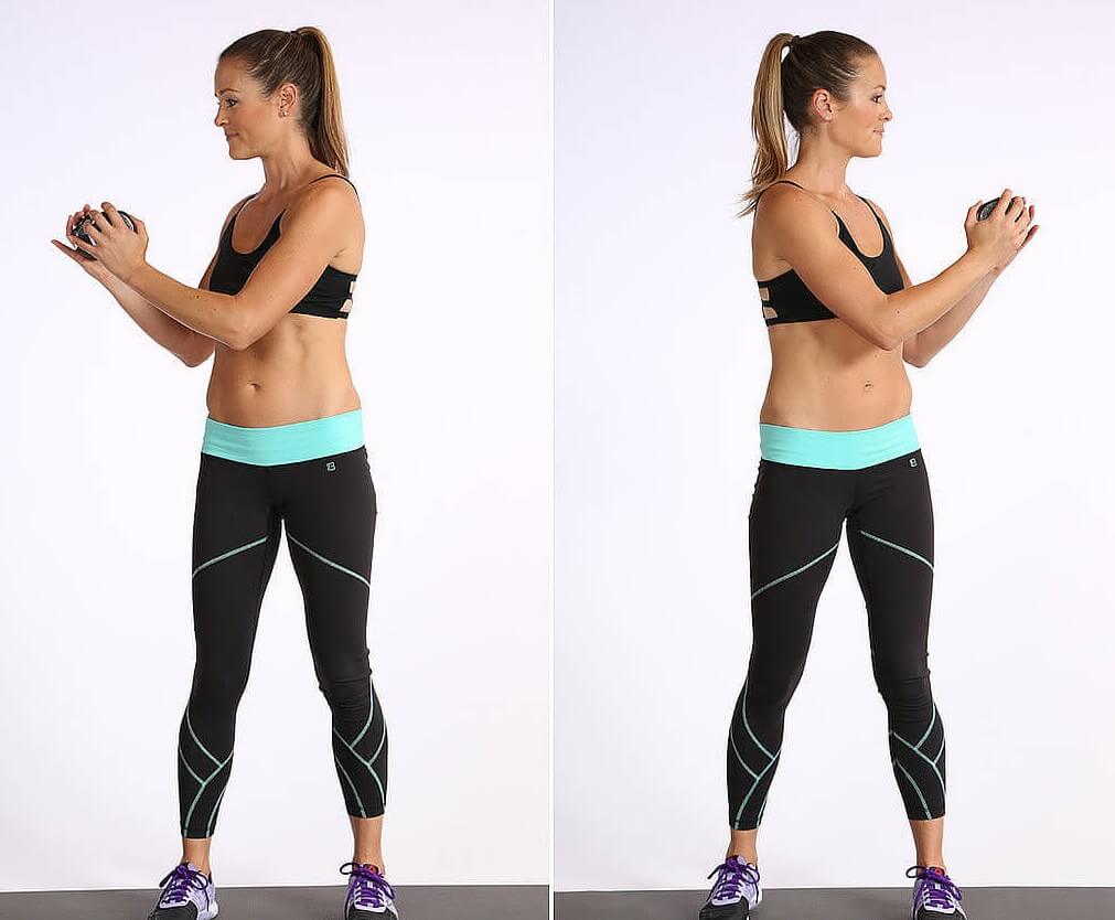 6. Талия (1 мин). Обопритесь о стену спиной, широко разведите ноги и слегка согните их в коленях. Затем сомкните руки в замок (или возьмите маленький мячик), держите их перед собой на уровне груди и поворачивайтесь из стороны в сторону, пытаясь руками дотронуться до стены.