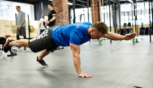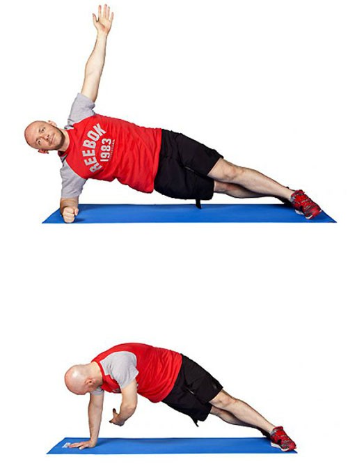 Сделай планку на боку. Руку, на которую не опираются, нужно поднять вверх, перпендикулярно полу. Потом заведи руку под торс и подними в изначальное положение. Повтори все действия на другом боку.