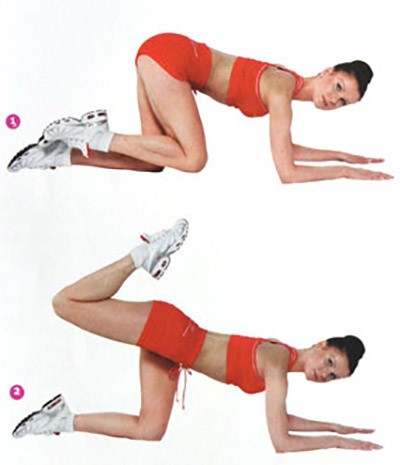 Встаньте на колени, прямые руки на полу: колени должны быть четко под попой, а кисти на уровне плеч, пальцы направлены вперед. Напрягите живот и поднимите вверх левую ногу, оставив ее согнутой. Не сгибайте и не выгибайте спину и не двигайте бедрами. Повторите 8-12 раз каждой ногой.