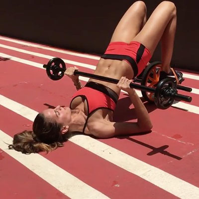 Обопритесь о фитнесбол, ноги согнуты в коленях прямо перед собой. Положите вес — гантелю или бодибар — на подвздошные кости. Сохраняя положение спины и коленей, медленно поднимите таз, напрягая ягодичные мышцы, до тех пор, пока корпус не станет полностью прямым — лопатки и плечи на фитнесболе. Медленно опустите таз на пол. Сделайте 3-4 подхода по 10-20 раз.