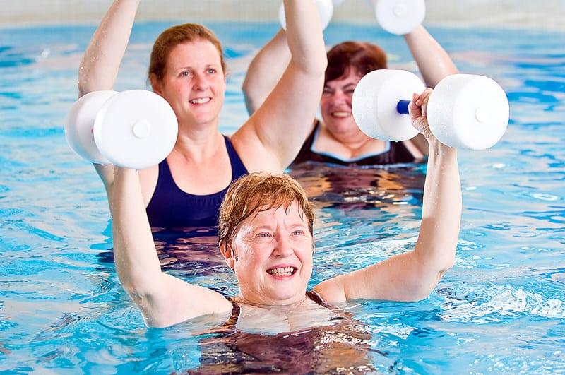 Когда вы адаптируетесь к начальному уровню нагрузки, тренер усложнит задачу. Чтобы придать тренировке силовую нагрузку, можно заниматься с гантелями, нудлами и другим спортивным инвентарем.