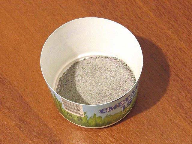 6. Засыпаем песок в одноразовую емкость, я отрезал пустую тару от