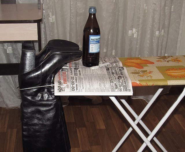 7. Сапоги фиксируем горизонтально, перед этим тщательно промыв подошву с мылом и высушив