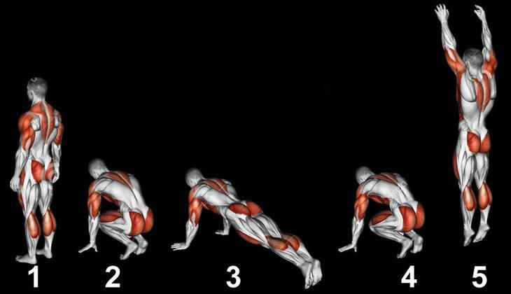 Приседайте, ставьте руки на пол и прыжком отводите ноги назад, вставая на носки. После чего, принимайте положение упор лёжа и отжимайтесь (отрываете верхнюю часть тела, а потом ноги, для девушек хорошо подойдёт вариант с отжиманием на коленях). Дальше прыжком подводите колени к рукам и выпрыгивайте вверх.
