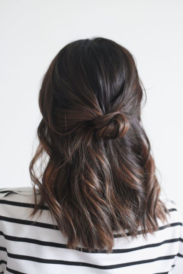 Как и в случае с half bun, “полуузел” – это прическа, при которой часть волос остается неубранной. Half knot может быть высоким – когда волосы собираются в петлю прямо на макушке, или обычным (когда петля делается на затылке):