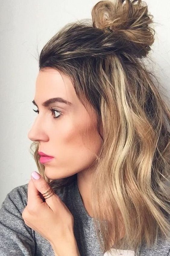 Укладка, при которой часть волос остается несобранной, а в пучок собираются только волосы верхней части головы. Отлично смотрится на обладательницах густых волос.