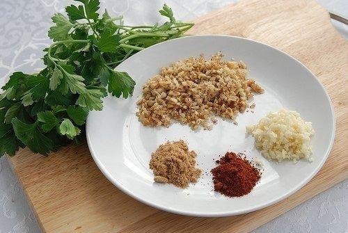 4. Tем временем порубить орехи,мелко порубить чеснок, нарезать зелень.