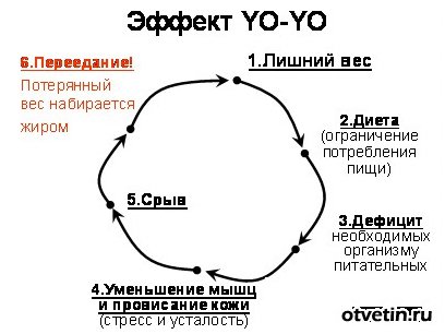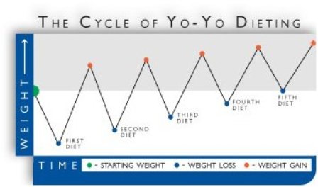 По вертикали: постоянно повышающийся с каждым циклом диет вес.