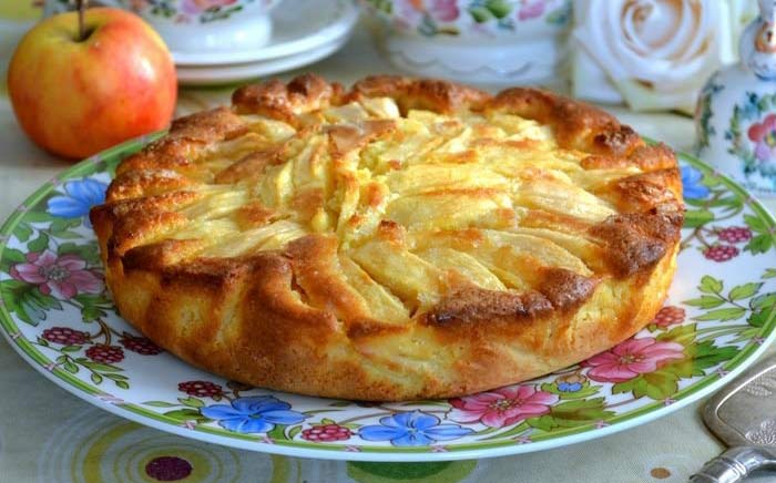 Дольки яблок уложите в тесто, в произвольном порядке. Сверху полейте пирог оставшимся маслом (25 г) и присыпьте ранее отложенным сахаром. Выпекайте в разогретой до 180°C духовке около 30-35 минут.