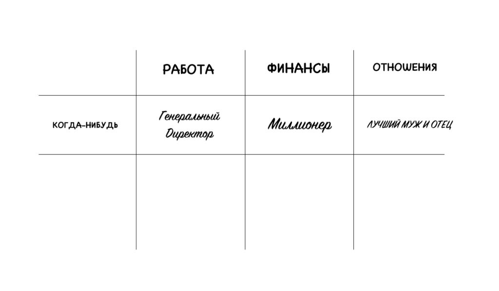 Далее выделите категории, по которым вы хотите разделить свой план. Например, семья, работа, финансы или путешествия. В каждую категорию занесите то, к чему вы хотите прийти в итоге.