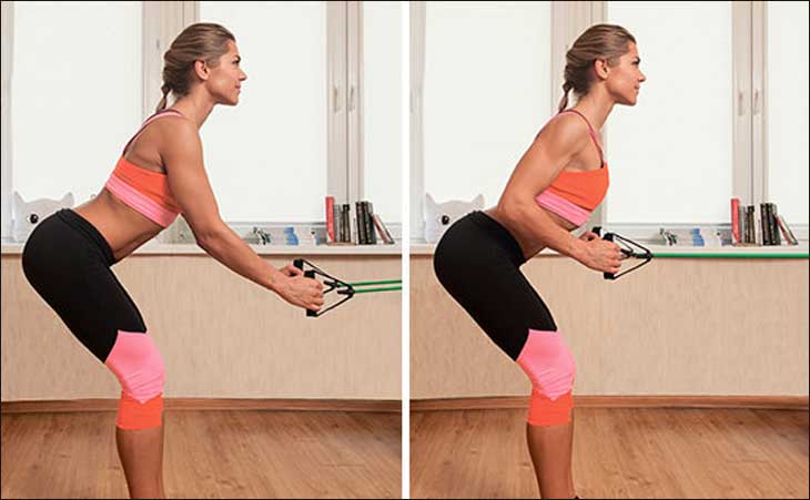 - Горизонтальная тяга к поясу стоя – 3-4 сета по 12-20 повторений
