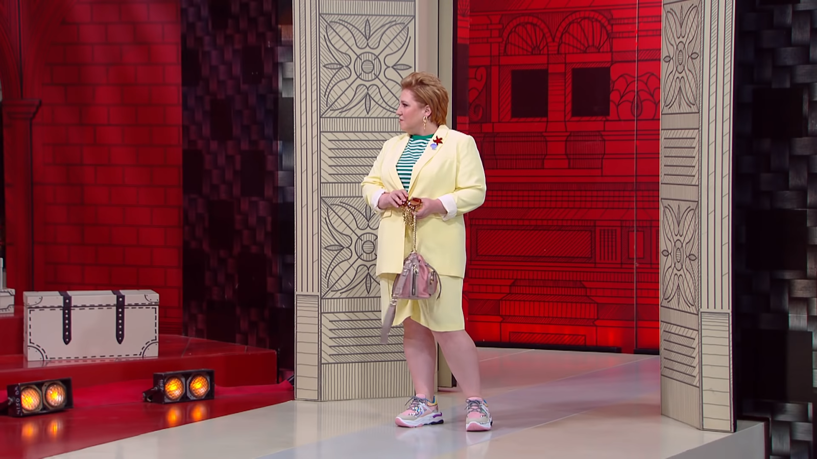 Костюм, приглушенного желтого цвета в сочетании с ярко-зеленой матроской выглядит на Ольге слегка нелепо. Стилисты плохо справились со вторым образом, не отследив длину бермуд, которым бы стоило «дотягиваться» за колено, и глубину выреза на футболке.