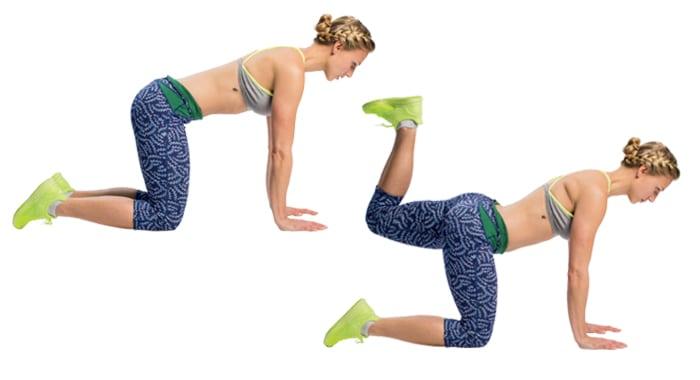 • Отведение ног назад. Становимся на четвереньки. По очереди отводим одну ногу назад и вверх, затем повторяем для второй.