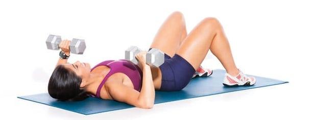 • Разведение рук в положении лежа. Выполнять упражнение надо в горизонтальном положении с гантелями. Ложимся на гимнастический коврик, ноги сгибаем в коленях. Руки вытягиваем перед собой, в ладонях зажаты гантели. Выполняем разведение рук в стороны, затем сводим конечности вместе.