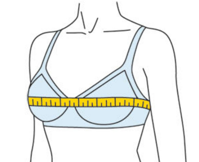 Стоя измерьте обхват непосредственно под грудью, держа измерительную ленту достаточно туго, но без сильного натяжения (она не должна сползать или, наоборот, впиваться в кожу).