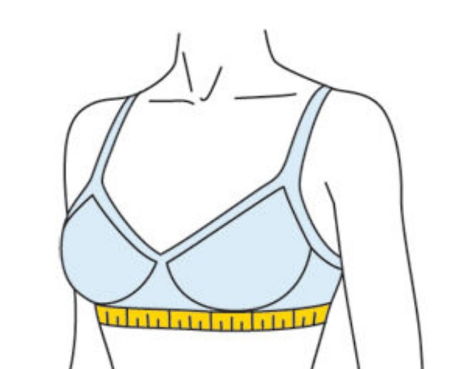 Стоя измерьте обхват непосредственно под грудью, держа измерительную ленту достаточно туго, но без сильного натяжения (она не должна сползать или, наоборот, впиваться в кожу).
