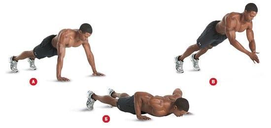 Упор лежа. Выполняем отжимания, подтягивая ногу коленом под живот, и касаясь ее локтем другой руки. Сначала сложно, потом привыкнете. Просто супер для похудения, работают все группы мышц. Когда станет слишком легко, вытягивайте руку вперед, имитируя движение скалолаза, лезущего вверх. Чем более быстрая смена движений – тем скорее будет результат.