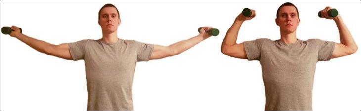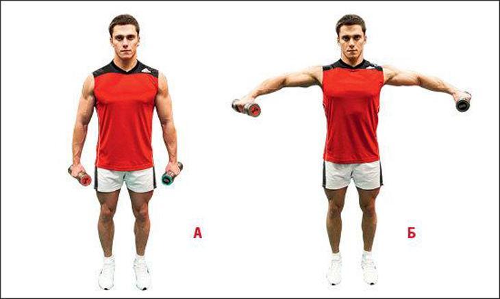 - Подъемы гантелей через стороны – сделайте 15 повторений