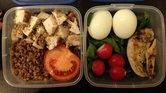 — термически обработанное мясо (никаких суррогатов типа сосисок и колбас!) и кашу (либо овощи, если Вы ограничены в употреблении углеводов). При этом не стоит использовать какие-либо заправки, кроме растительного масла, во-первых, они значимо повышают калорийность (я про соусы и майонезы), во-вторых, в тепле способствуют более быстрой порче продуктов.
