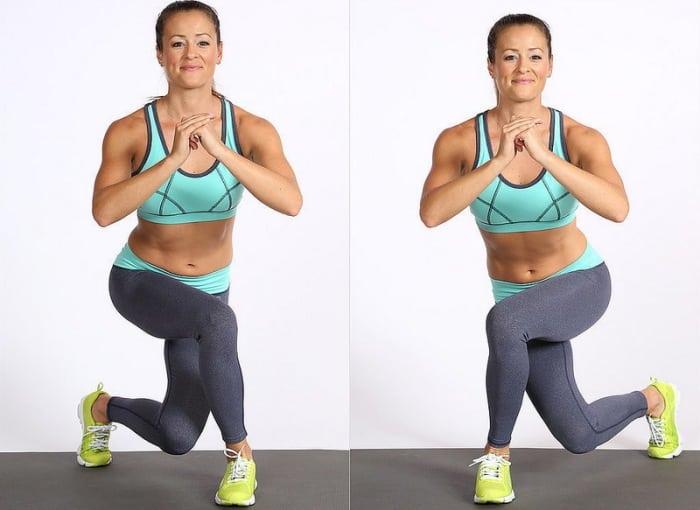 - Реверанс. Стоим ровно, одна нога отведена назад, упираемся ею на носок. Приседаем так, чтобы бедро ноги, стоящей впереди, было параллельно полу, а колено задней «смотрело» в пол.