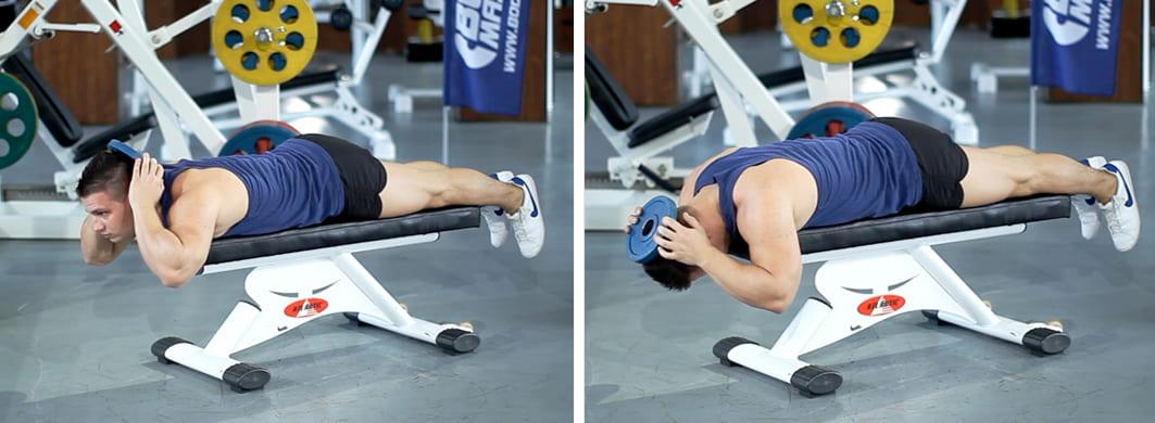 - Подъем головы, лежа на животе. Необходимо лечь животом на лавку, зафиксировать ноги. Далее берем блин, заводим его на голову и удерживаем двумя руками на уровне затылка. Следующий шаг – опускаем голову вниз, затем поднимаем вверх, при этом, работает только шея, корпус остается неподвижен.