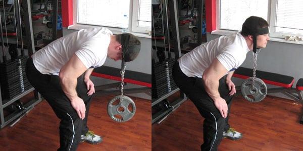 - Сгибание и разгибание шеи с отягощением. Упражнение выполняется с помощью специального шлема с лямкой. Для изготовления приспособления подойдет обычный ремень. Нужно его зафиксировать на голове, с помощью крюка к ней крепится утяжеление (блин). Атлет стоит, ноги слегка согнуты, руки упираются в бедра, корпус слегка наклонен. Необходимо наклонять голову вниз и выпрямлять ее до того, как она станет параллельна полу.