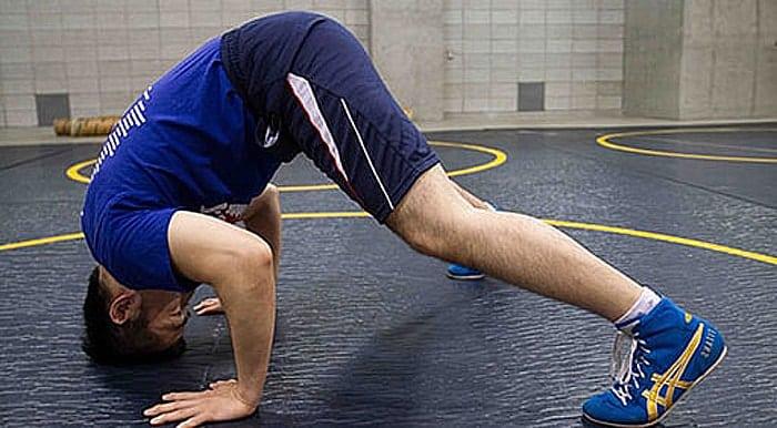- Стойка «борцовский треугольник». Упражнение аналогично стойке на мосту, но спортсмен наклоняется вперед. Нужно стать ровно, ноги расставить по шире, затем наклониться вниз и упереться лбом в пол. Выполняем перекаты со лба на макушку и обратно.