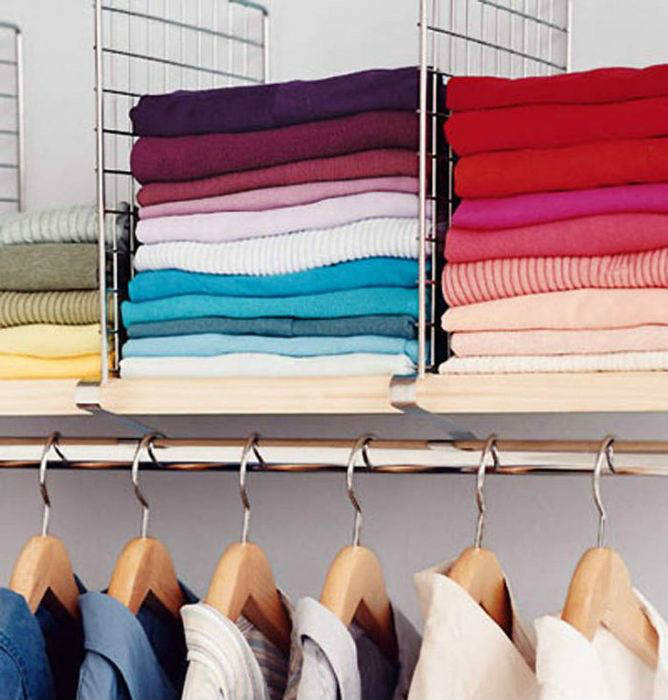 • По цвету. Так, не придётся долго искать среди всего разнообразия вещей жёлтый свитер или розовую блузу, а гармоничные цветовые переходы будут только поднимать настроение.