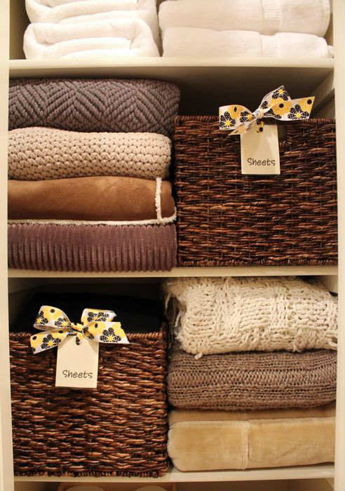 Сезонные вещи можно спрятать в корзины и убрать на шкаф