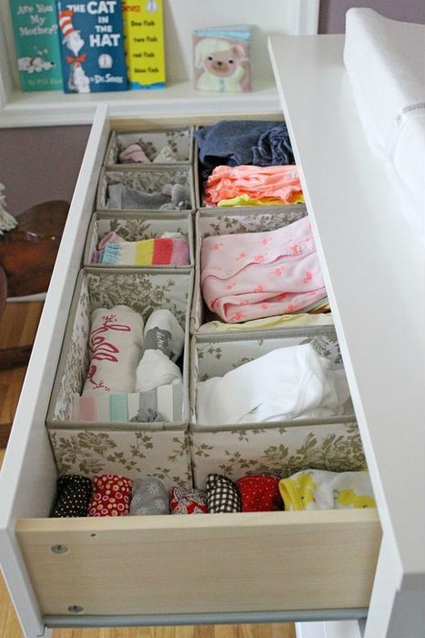 Самое сложное – соблюсти идеальный порядок в выдвижных ящиках. Чтобы сделать это, и вместить как можно больше вещей, нужно аккуратно скрутить их и сложить в вертикальном положении. В качестве разделителей можно использовать картонные перегородки и трубочки, которые иногда остаются после шоппинга.