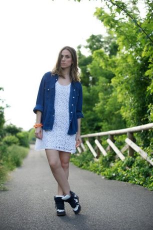 К кедам можно подобрать джинсовые платья, только важно правильно подобрать длину. Обувь на плоской подошве и наряд средней длины – ноги выглядят укороченными. Фасон юбки лучше подбирать пышный, расклешенный.